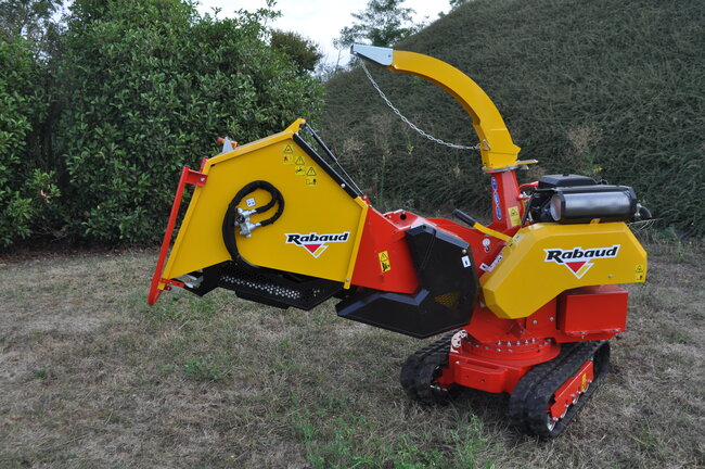- Passage de bois de Ø 110 mm Maxi, entraînement Moteur thermique de 21 Ch HONDA, monté sur châssis équipé de Chenilles