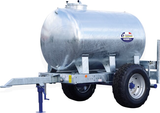 • Citerne sur châssis roulant 4400L homologuée route 25km/h/ pneu en 11.5/80 15.3 / sortie arrière en 76mm+ 20/27 / 2 Sorties avant 33/42mm