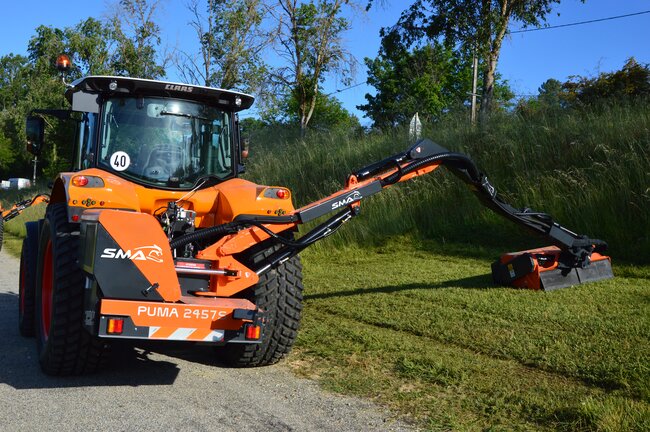 Portée horizontale de 5,70 m. Bras en S ergonomie et visibilité sur l'outil. Puissance rotor 82 CH. PDF 1 000 tr/min. Commande monolevier électrique ELEC 4, 4 fonctions, joystick et afficheur indépendants. Pivot centré 110°, sécurité hydraulique sur pivot. Renversement de flèche par vérin double. Pompe rotor et moteur à pistons TP, circuit fermé. Radiateur à dépoussiérage automatique. Outil TP PREMIUM, rotor 1,25 m. Spire H, 56 couteaux Y. Coffre à outils intégré. Disponible en portée 5.00 m.