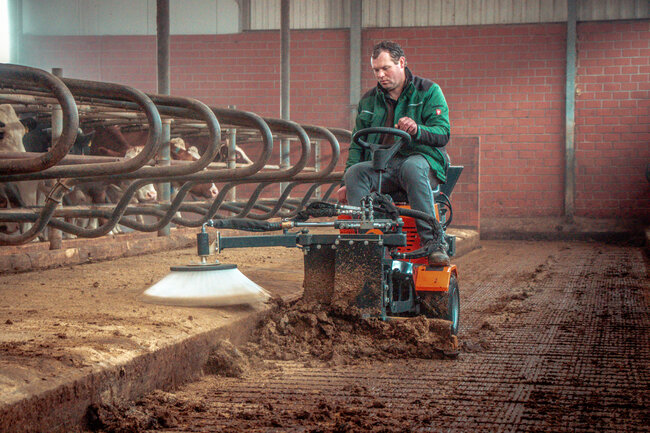 Balai logette déportable par vérin avec roues de jauge ou racleur caillebotis.