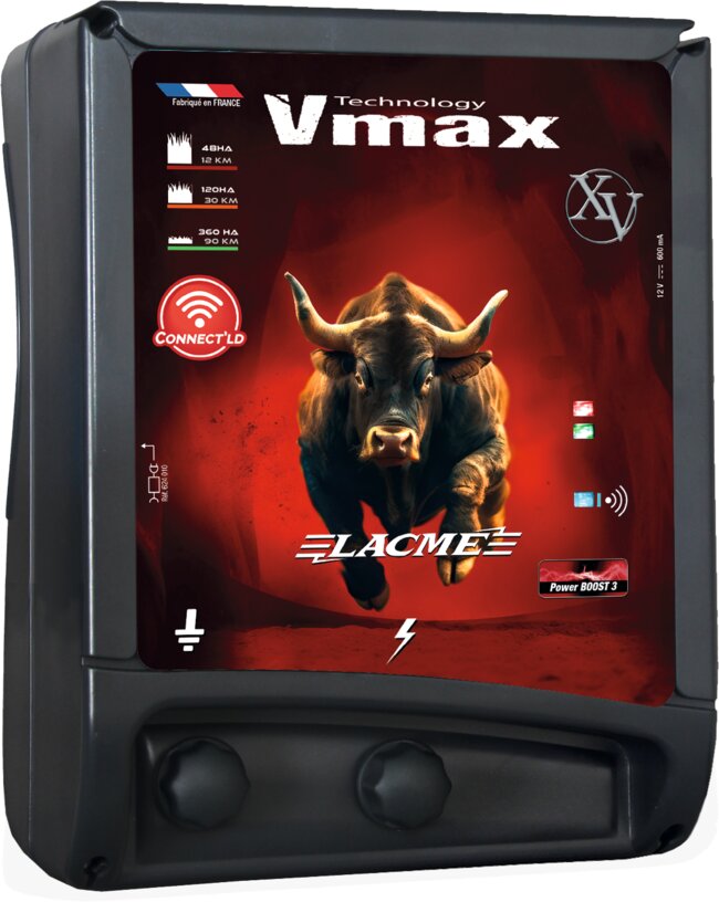 Electrificateur nouvelle génération VMax permettant une performance de garde inégalée lorsque la végétation a envahi complètement la clôture (UBI). Sa très haute tension, sans égale dans ces conditions, permet de transporter l'impulsion POWER BOOST 3 même à travers les herbes denses et sur de très longues distances.